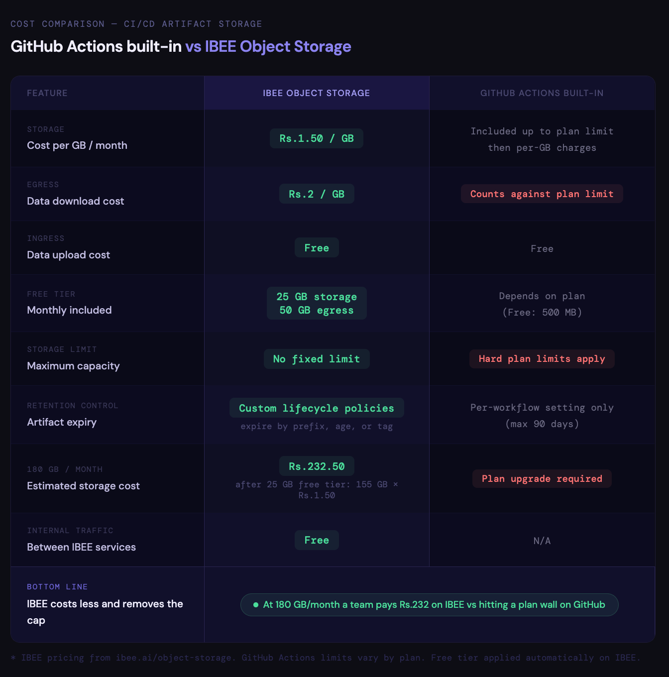 Cost comparison table between GitHub Actions built-in artifact storage and IBEE object storage for CI/CD pipelines