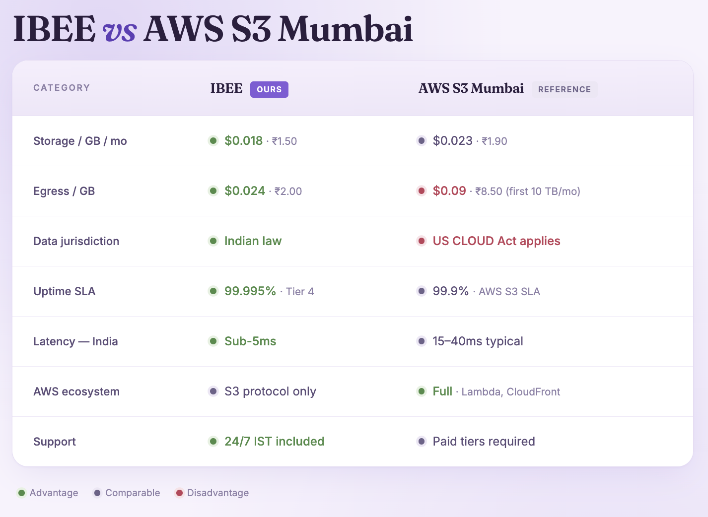 For businesses mainly serving users in India or South Asia, where the need is simple storage and file delivery without heavy AWS service dependencies, IBEE often becomes the better choice. Lower egress pricing, clear data sovereignty, Tier 4 reliability, and predictable costs all add up.