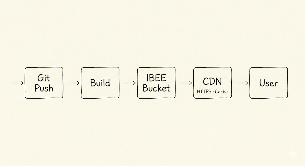 Git push triggers build. Build output syncs to IBEE bucket. CDN caches at edge. Users never hit the origin directly.