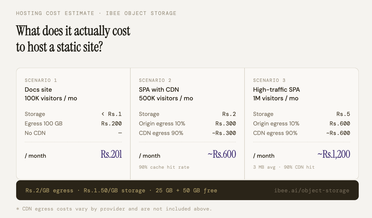 For a documentation site or marketing page with 100,000 monthly visitors loading an average of 1 MB of assets: 100 GB of monthly egress at Rs.2/GB is Rs.200 per month. Storage for the build output is under Rs.1 per month.