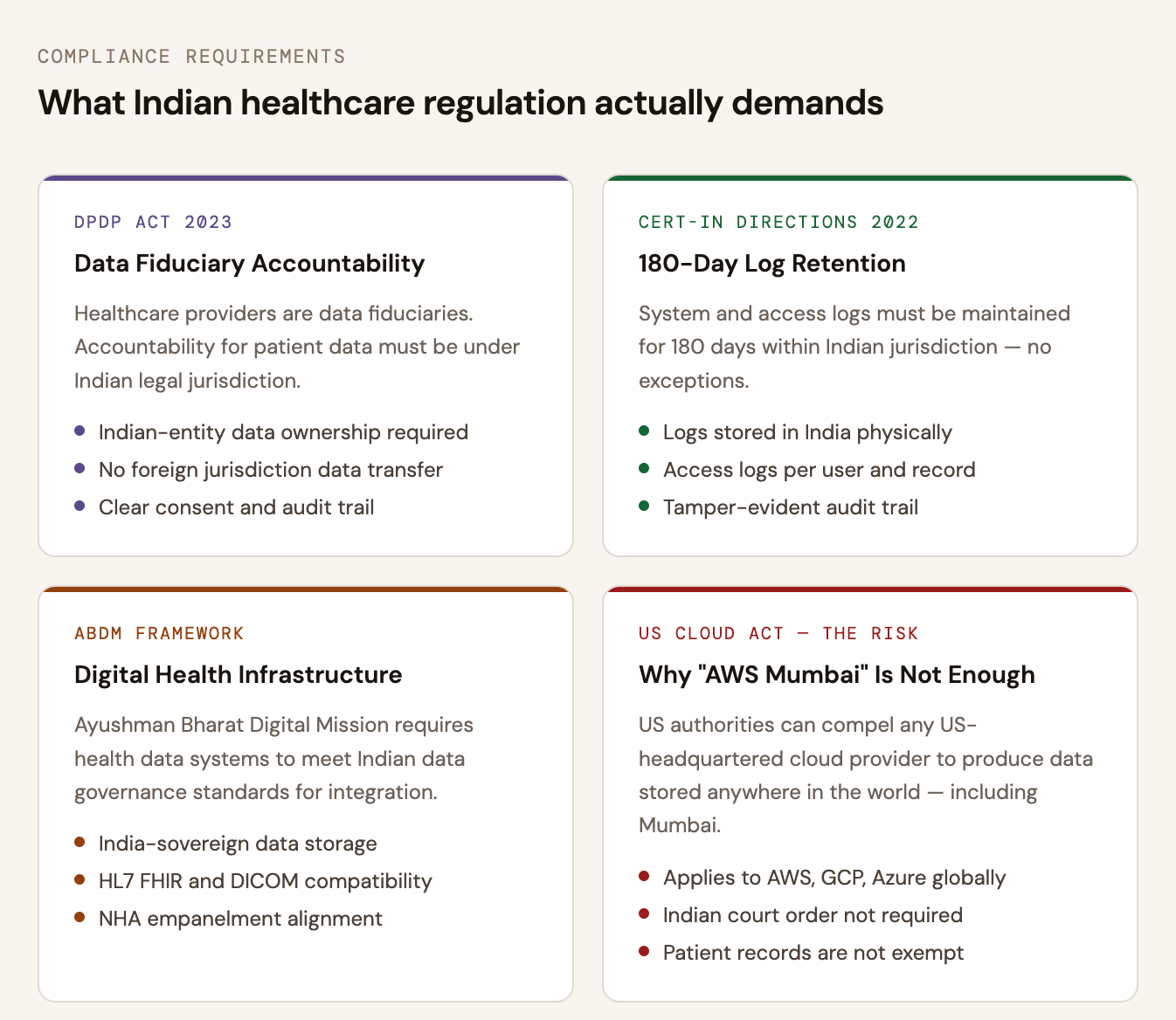 CERT-In's April 2022 directions require maintaining logs for 180 days within Indian jurisdiction. The DPDP Act establishes accountability for data fiduciaries. ABDM sets integration and data handling standards. NMC and state medical council guidelines are evolving. Running this on infrastructure governed by foreign law and without native India compliance documentation creates audit exposure at every level.