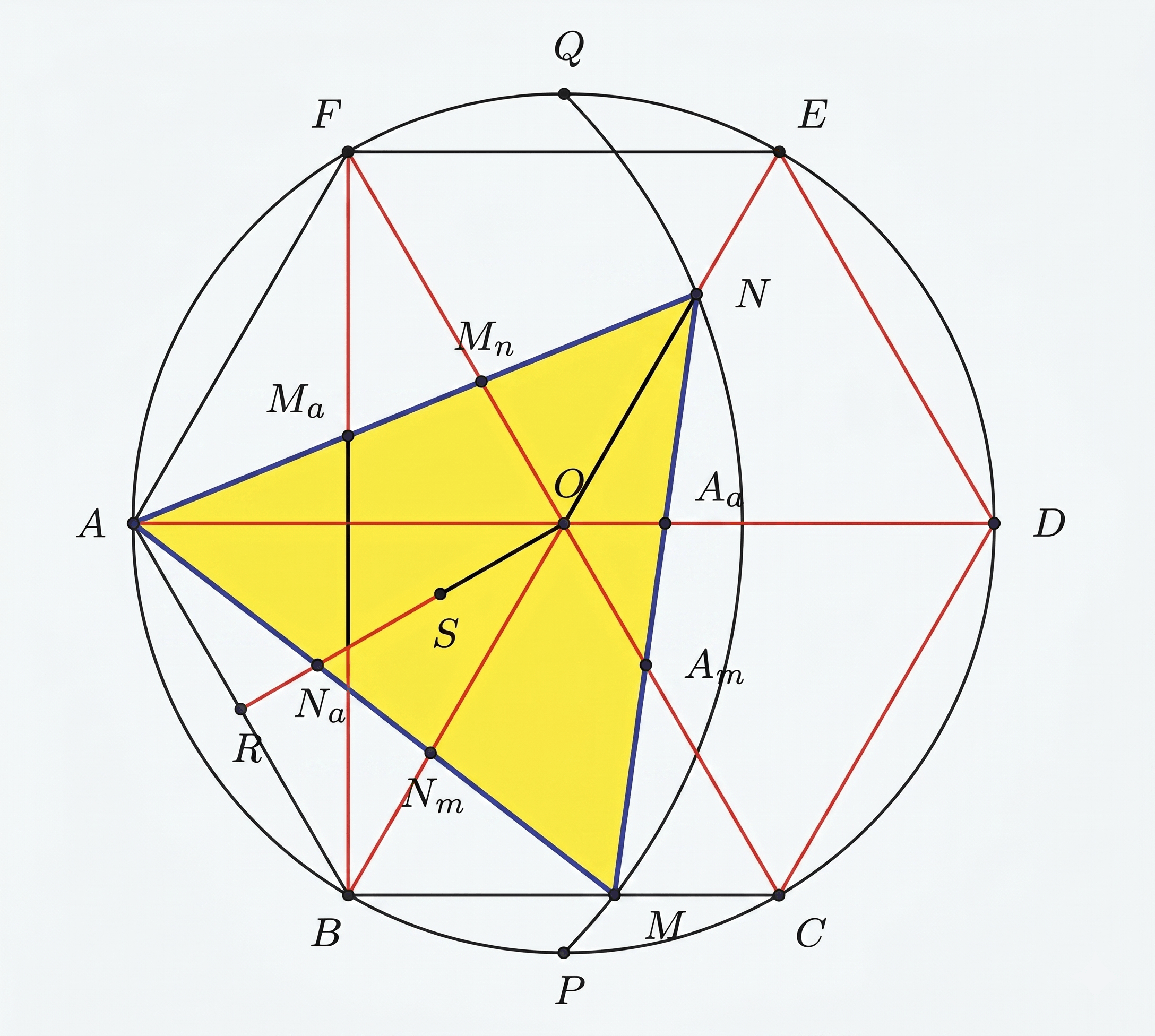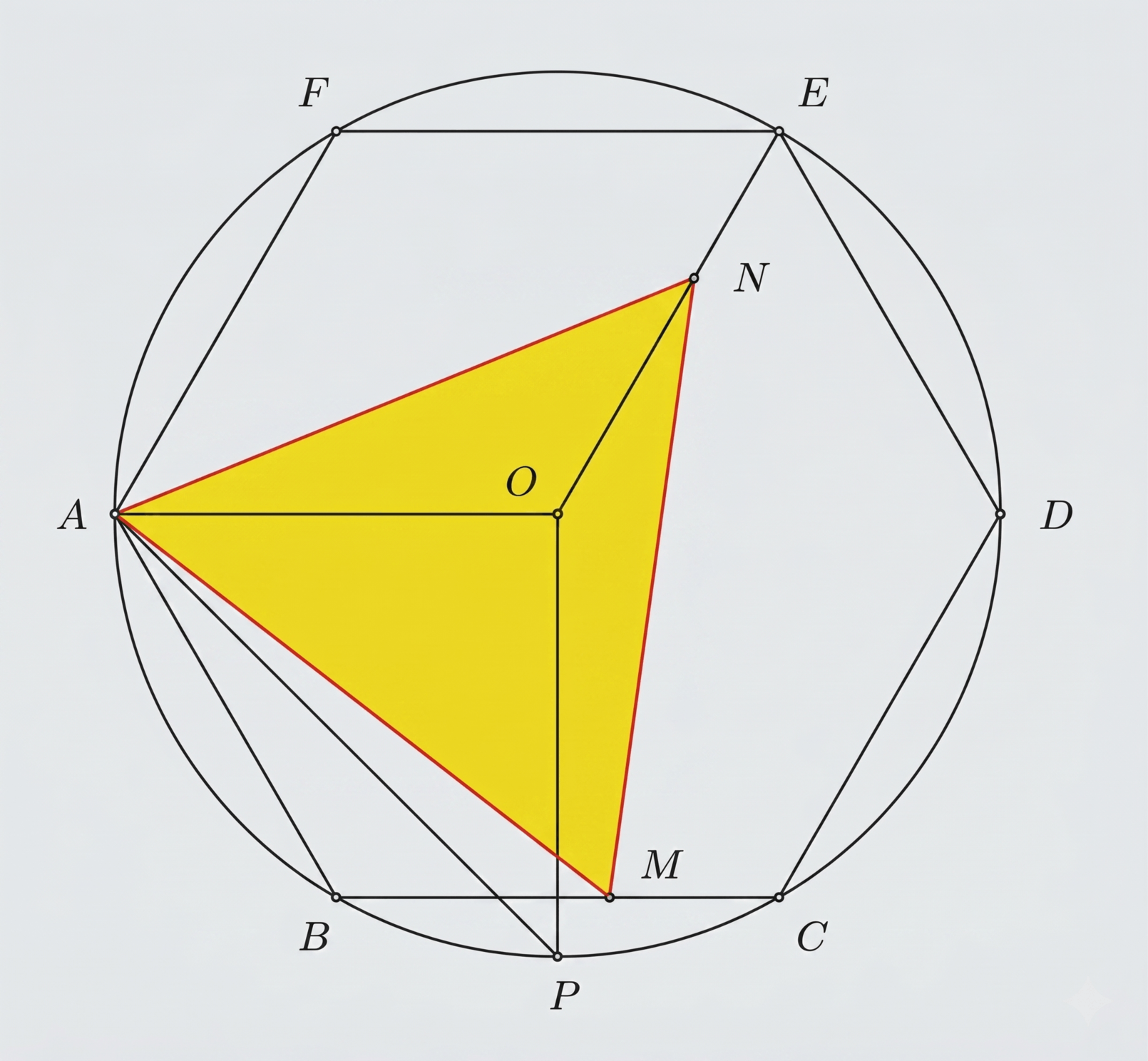 Within the hexagon, golden points were precisely identified using a key property: the area of a regular hexagon ABCDEF is exactly 3 times the area of triangle AMN — if and only if point M divides side BC in the golden ratio. These intersection points guided the internal geometry of the logo mark.